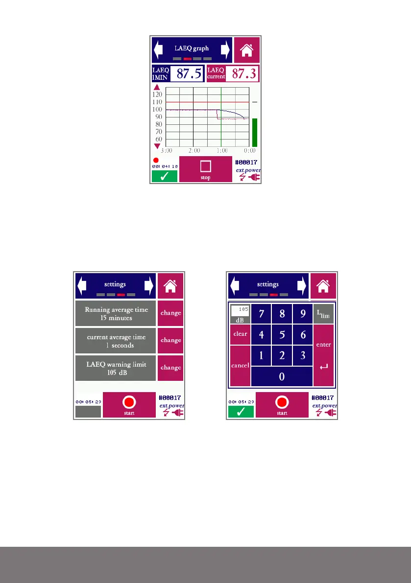 Screen 2 of the LAEQ module, showing a graph of how the average LAEQ is developing.