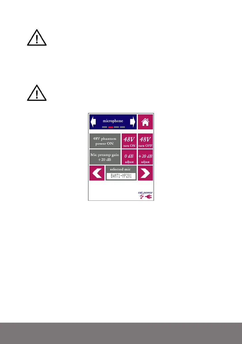 From the “microphone” screen, the 48V phantom power can be switched on and off. If the