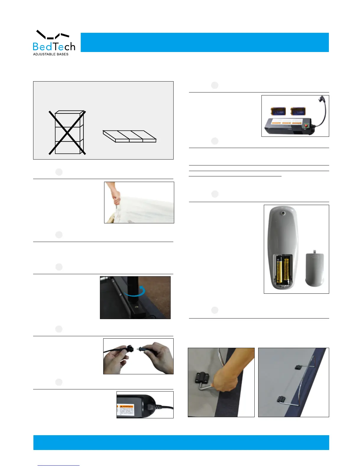 bedTech BT2000 - Adjustable Base Installation Guide; Foundation Unpacking and Leg Attachment; Power Connection and Battery Setup