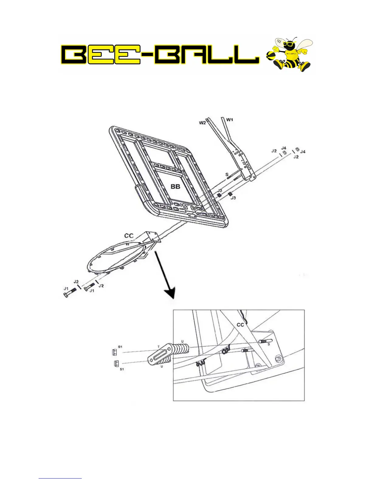 Attach the ring (CC) to the backboard (BB) and the brace (W1/W2) using the U bolt (S) through the two