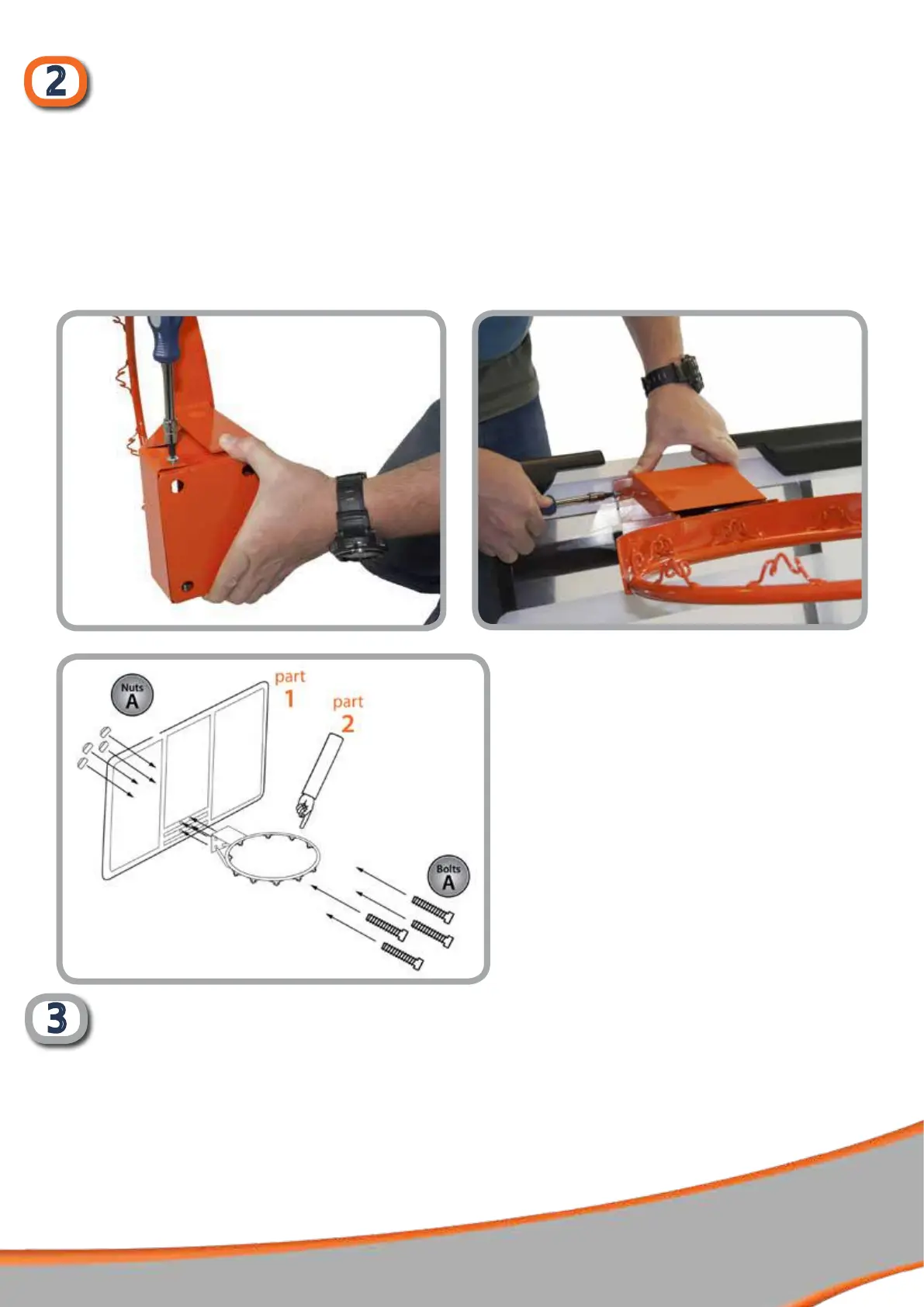 Fix the Hoop/Ring (part 2) to the front of the Backboard (part 1) using four Bolts, Nuts & Washers A.