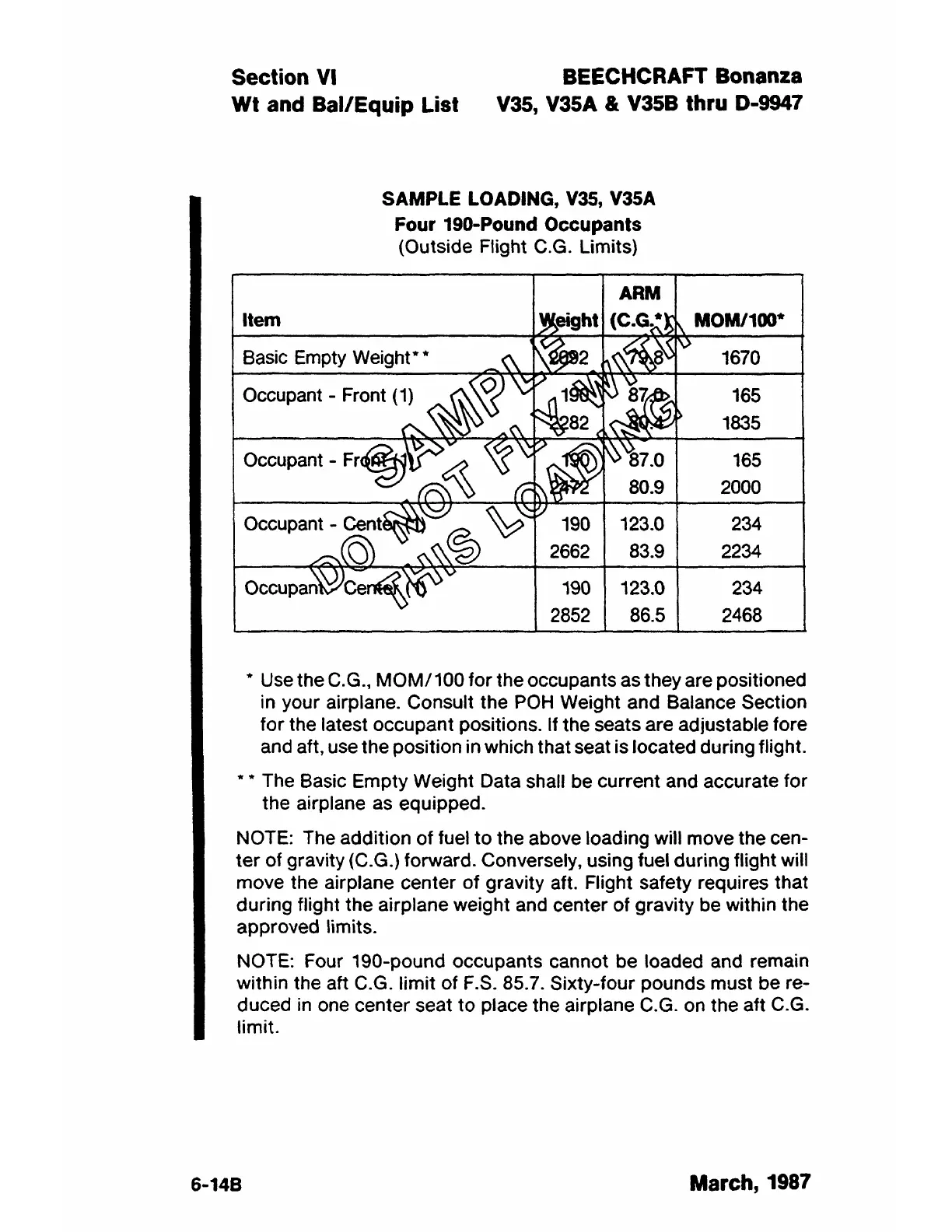* Use the C.G., MOM/ 100 for the occupants as they are positioned