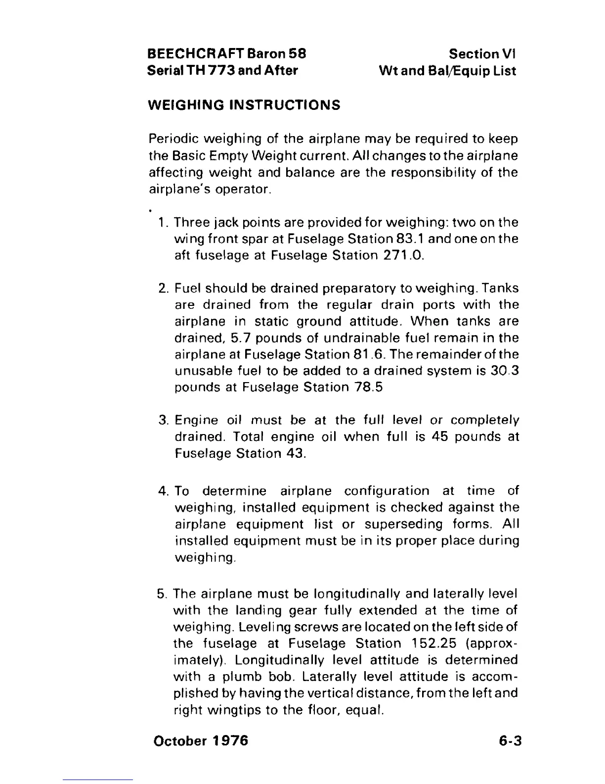 Beechcraft Baron 58 - Weighing Instructions; BEECHCRAFT Baron 58