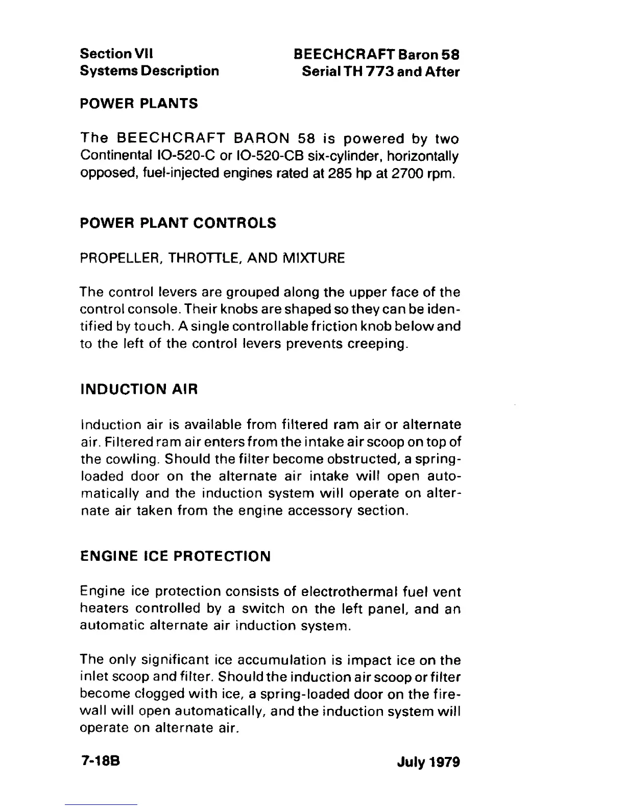 Beechcraft Baron 58 - Power Plant Controls; Propeller, Throttle and Mixture; Induction Air; Engine Ice Protection