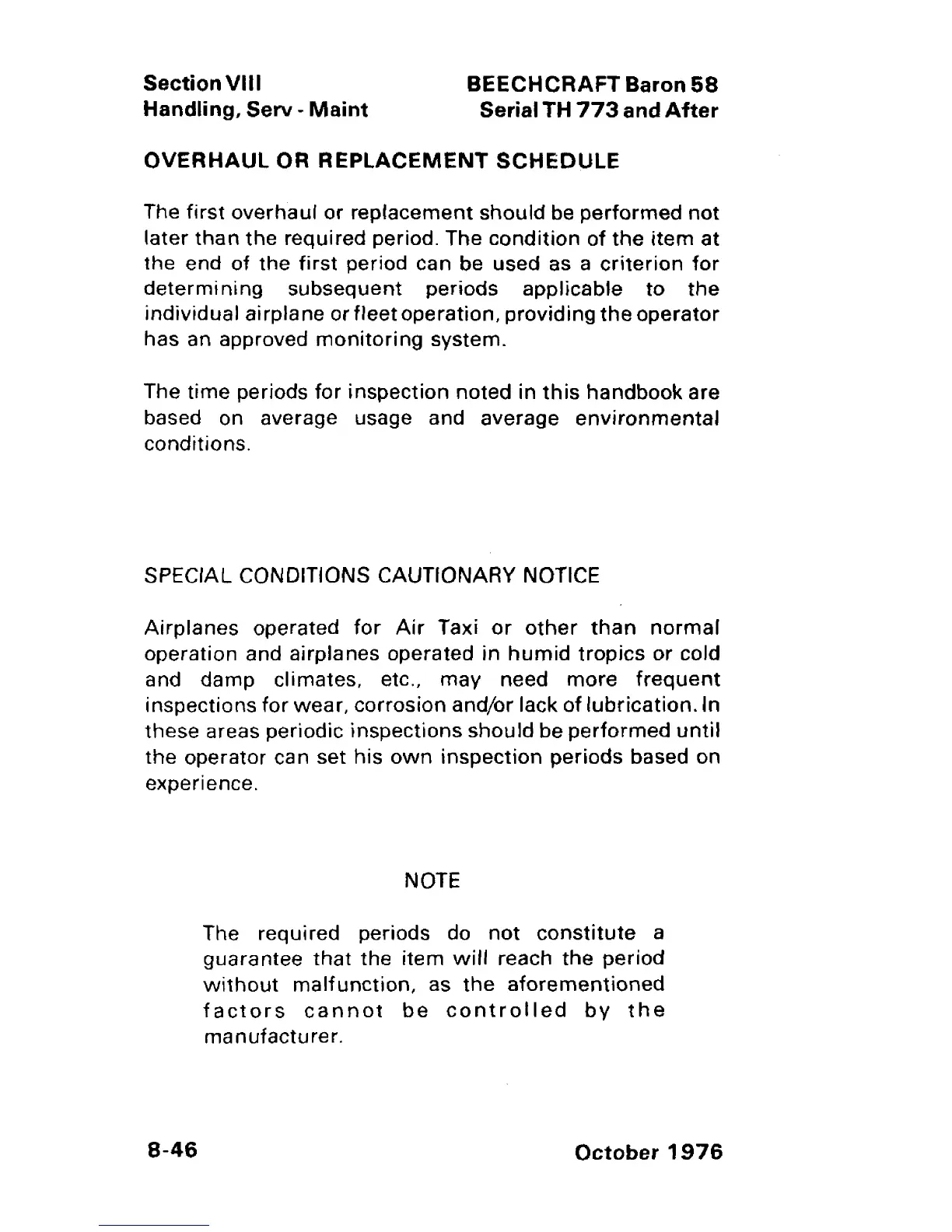 Beechcraft Baron 58 - Overhaul or Replacement Schedule; Special Conditions Cautionary Notice