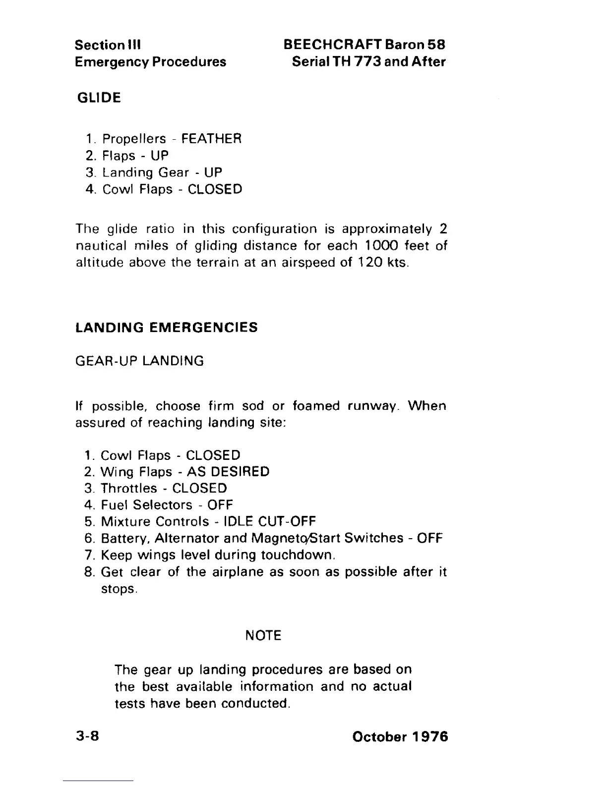 Beechcraft Baron 58 - Glide; Landing Emergencies; Gear up Landing