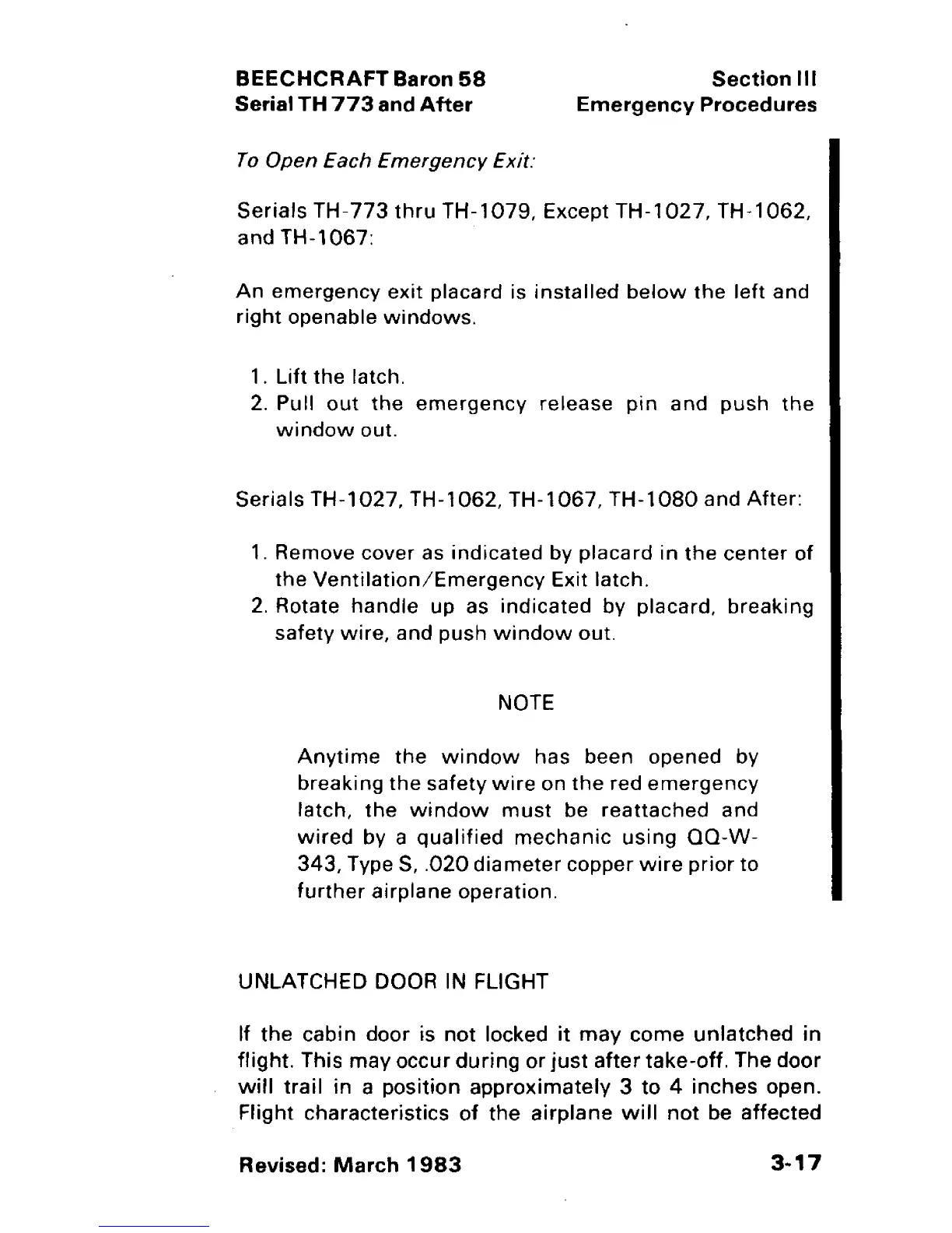 Beechcraft Baron 58 - Unlatched Door in Flight; To Open each Emergency Exit