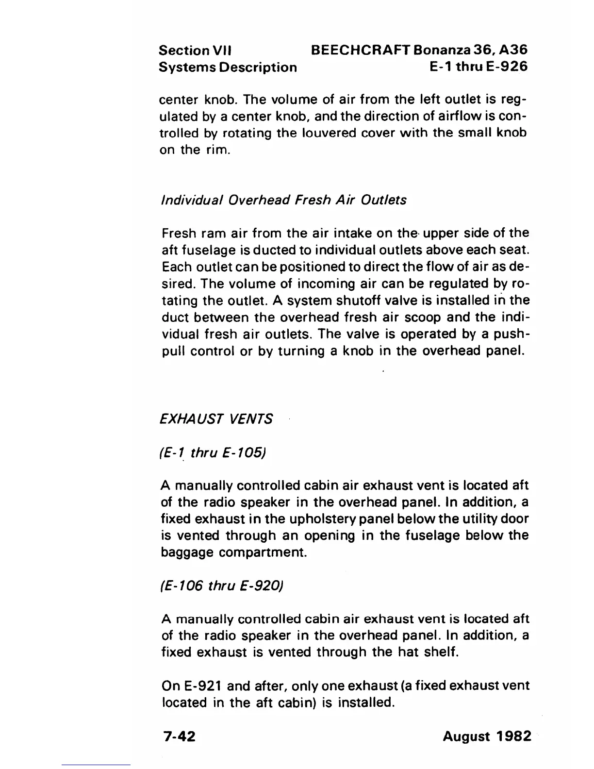 Beechcraft Bonanza 36 - Exhaust Vents; Individual Overhead Fresh Air Outlets