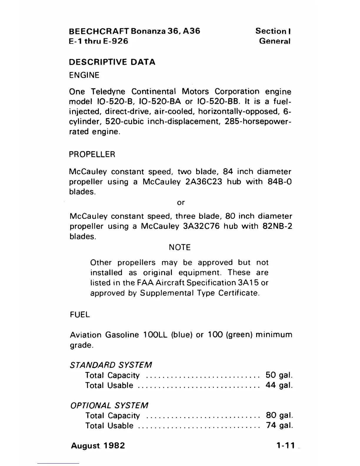 Beechcraft Bonanza 36 - Descriptive Data; Engine; Propeller; Fuel