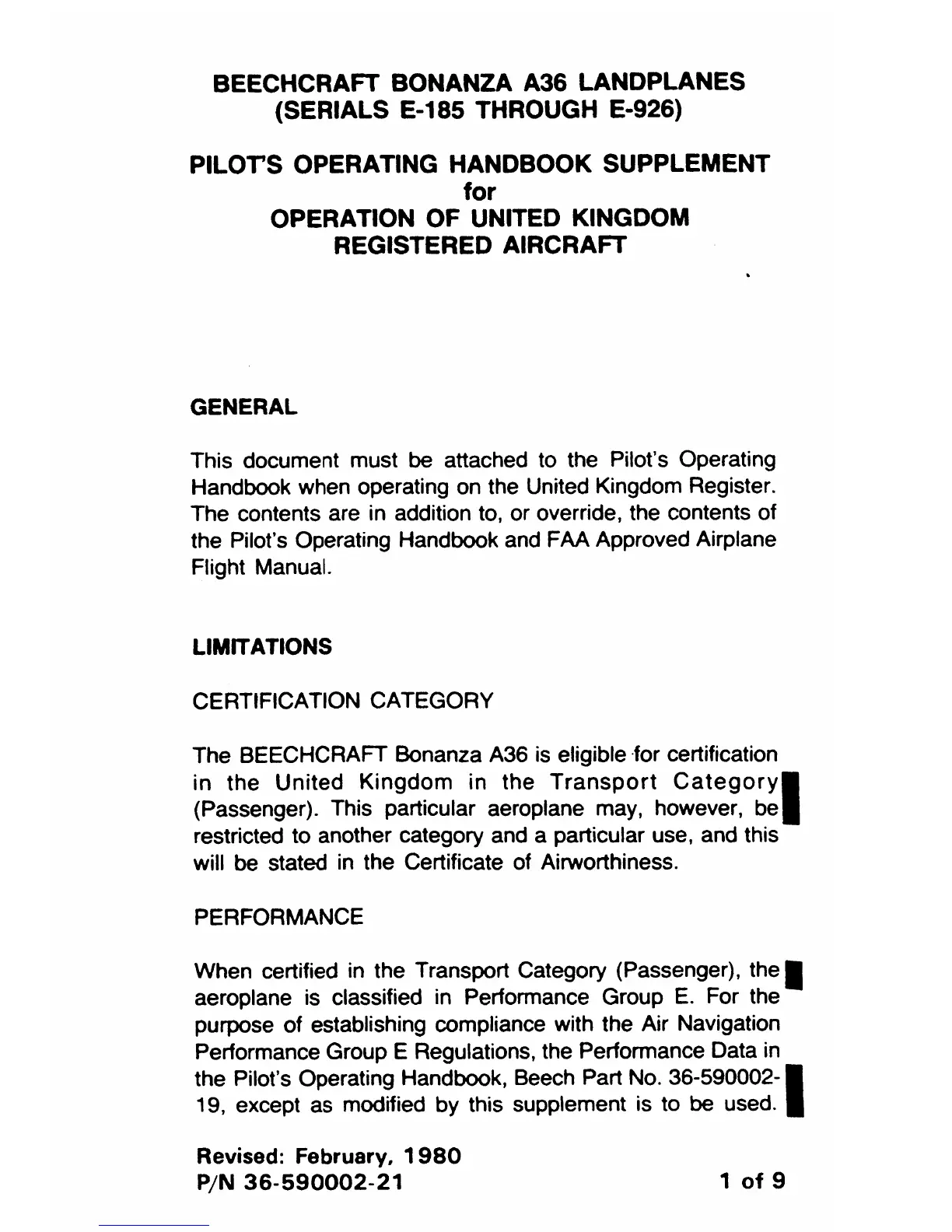 Beechcraft Bonanza 36 - Operation of United Kingdom Registered Aircraft