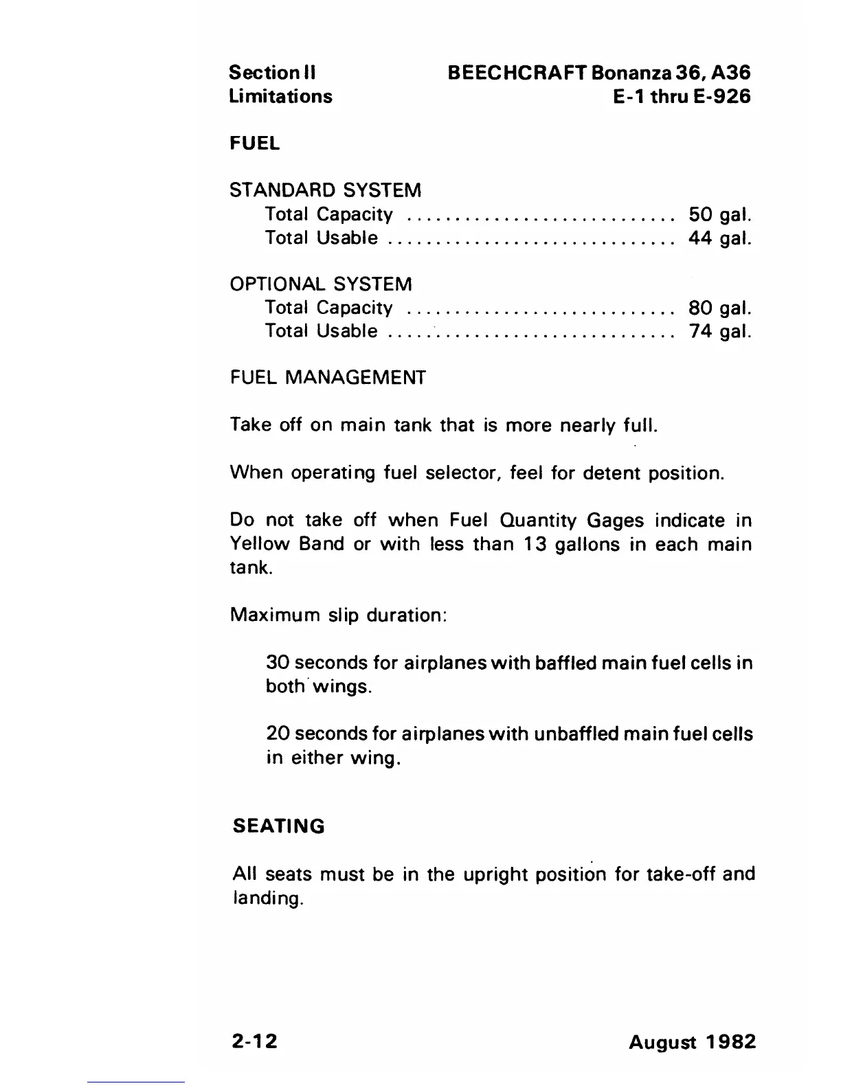 Beechcraft Bonanza 36 - Fuel Management; Maximum Slip Duration; Seating
