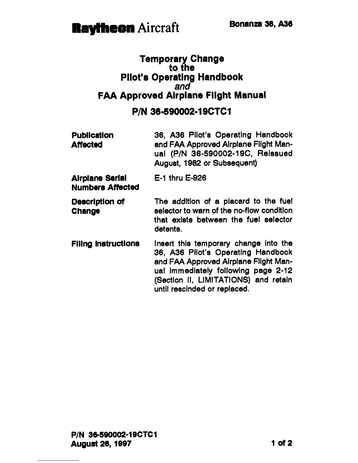 Beechcraft Bonanza 36 - Temporary Change to the Pilots Operating Handbook