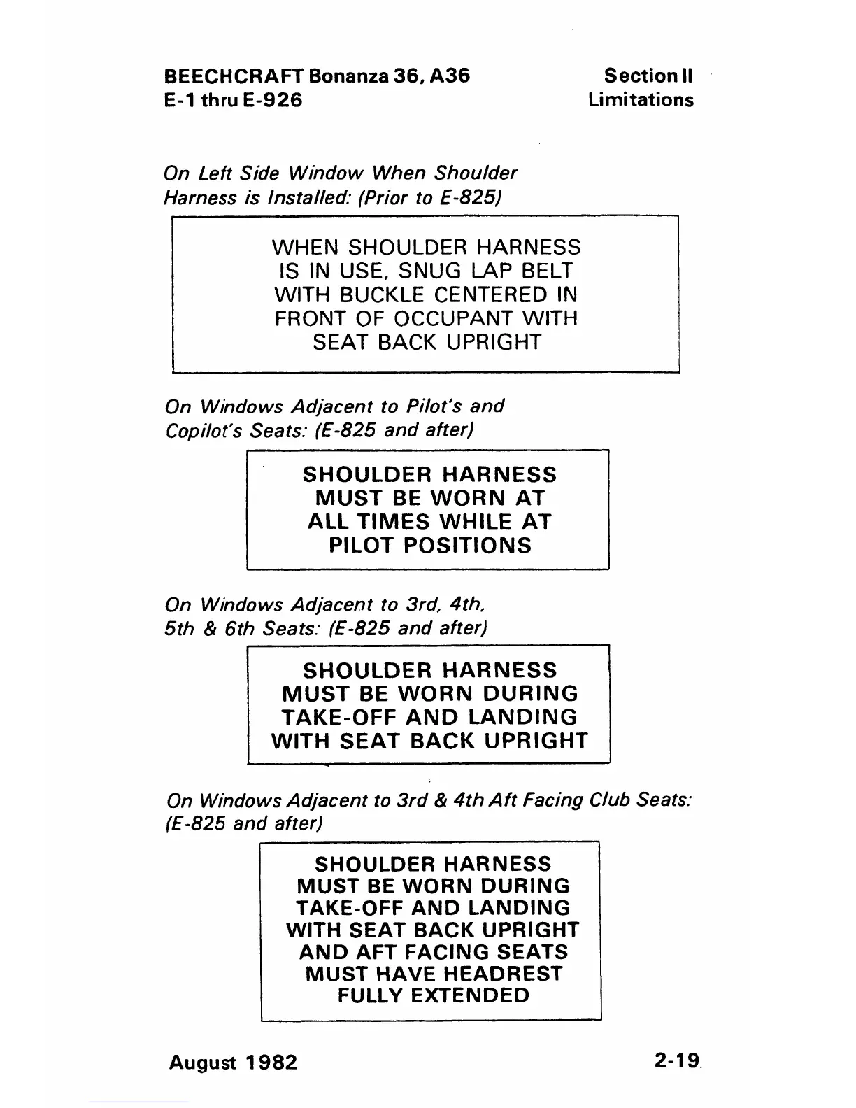 Beechcraft Bonanza 36 - Placards on Left Side Window When Shoulder Harness Is Installed; Placards on Windows Adjacent to Pilots and Copilots Seats; Placards on Windows Adjacent to 3 Rd, 4 Th, 5 Th and 6 Th Seats; Placards on Windows Adjacent to 3 Rd and 4 Th Aft Facing Club Seats