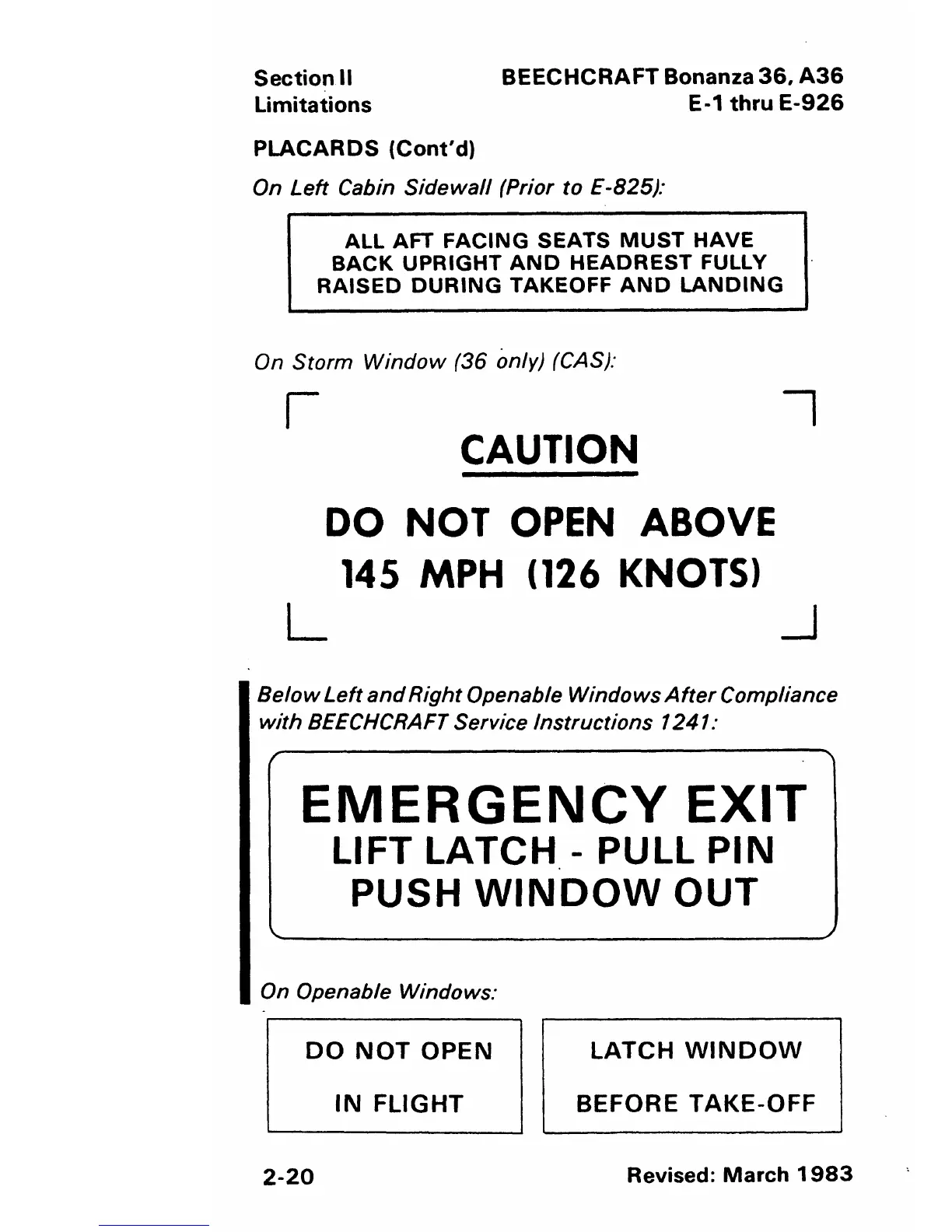 Beechcraft Bonanza 36 - Placards on Left Cabin Sidewall; Placards on Storm Window; Placards below Left and Right Openable Windows; Placards on Openable Windows