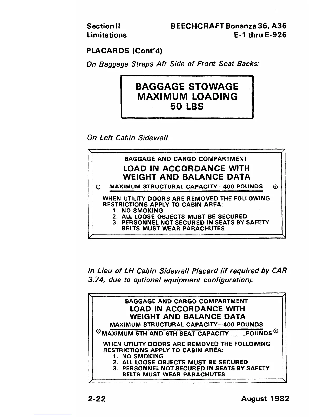 Beechcraft Bonanza 36 - Placards on Baggage Straps Aft Side of Front Seat Backs; Placards Left Cabin Sidewall; Placards in Lieu of LH Cabin Sidewall Placard