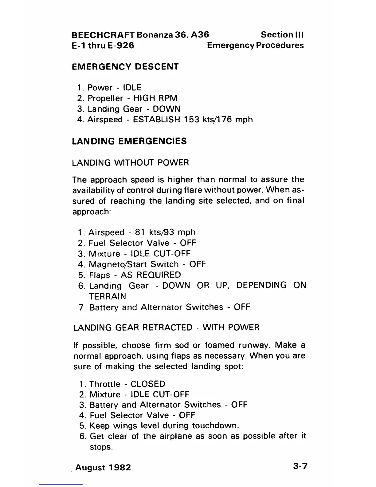 Beechcraft Bonanza 36 - Emergency Descent; Landing Emergencies; Landing Without Power; Landing Gear Retracted - with Power