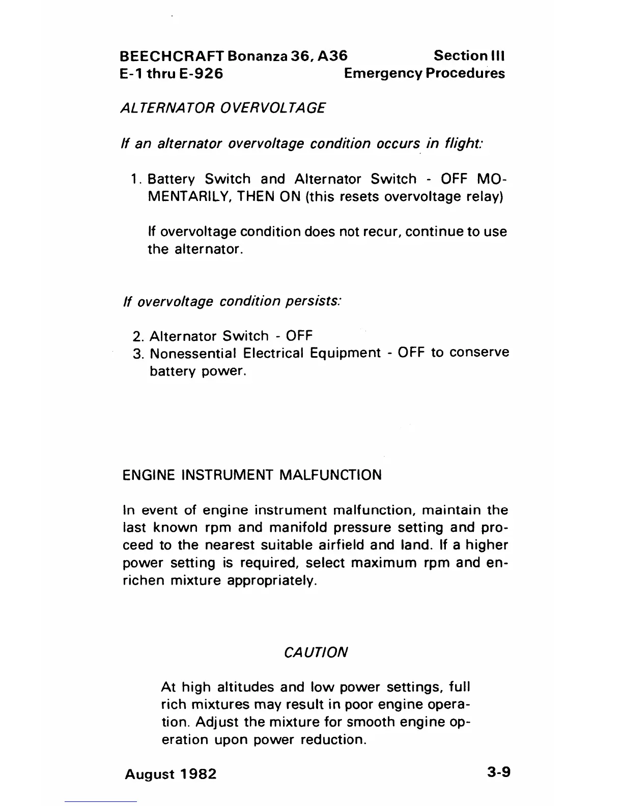 Beechcraft Bonanza 36 - Alternator Overvoltage; Engine Instrument Malfunction; If an Alternator Overvoltage Condition Occurs in Flight; If Overvoltage Condition Persists