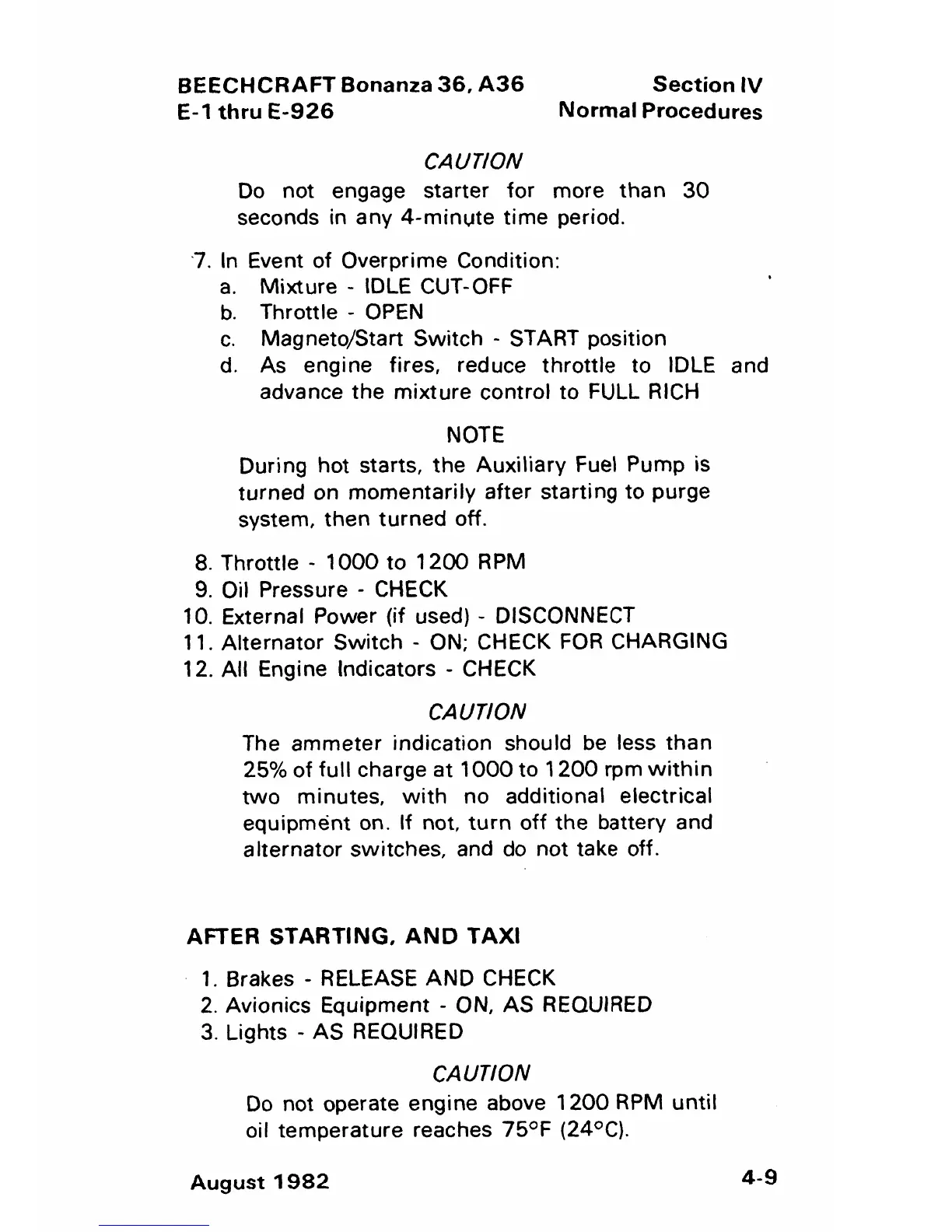 Beechcraft Bonanza 36 - In Event of Overprime Condition; After Starting, and Taxi