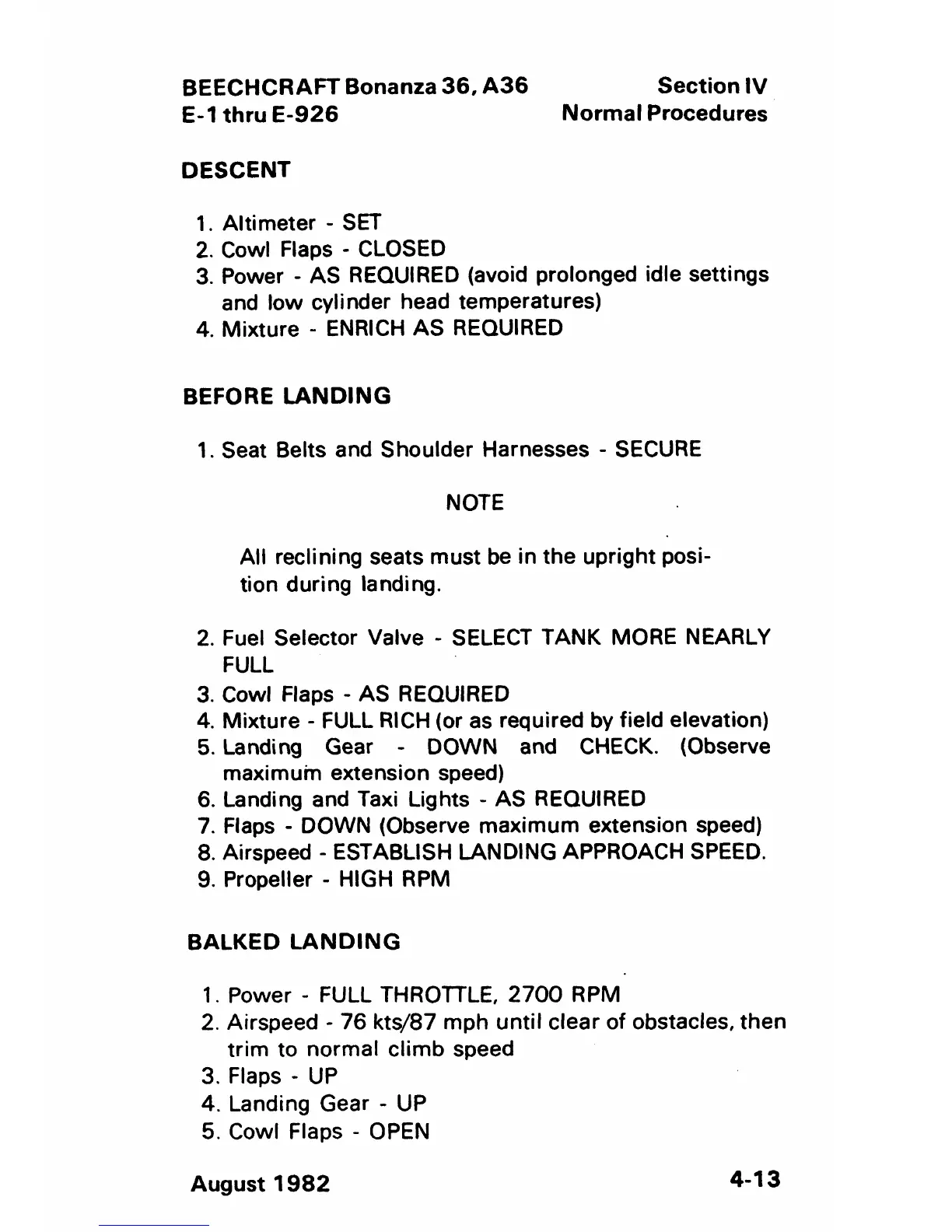 Beechcraft Bonanza 36 - Descent; Before Landing; Balked Landing