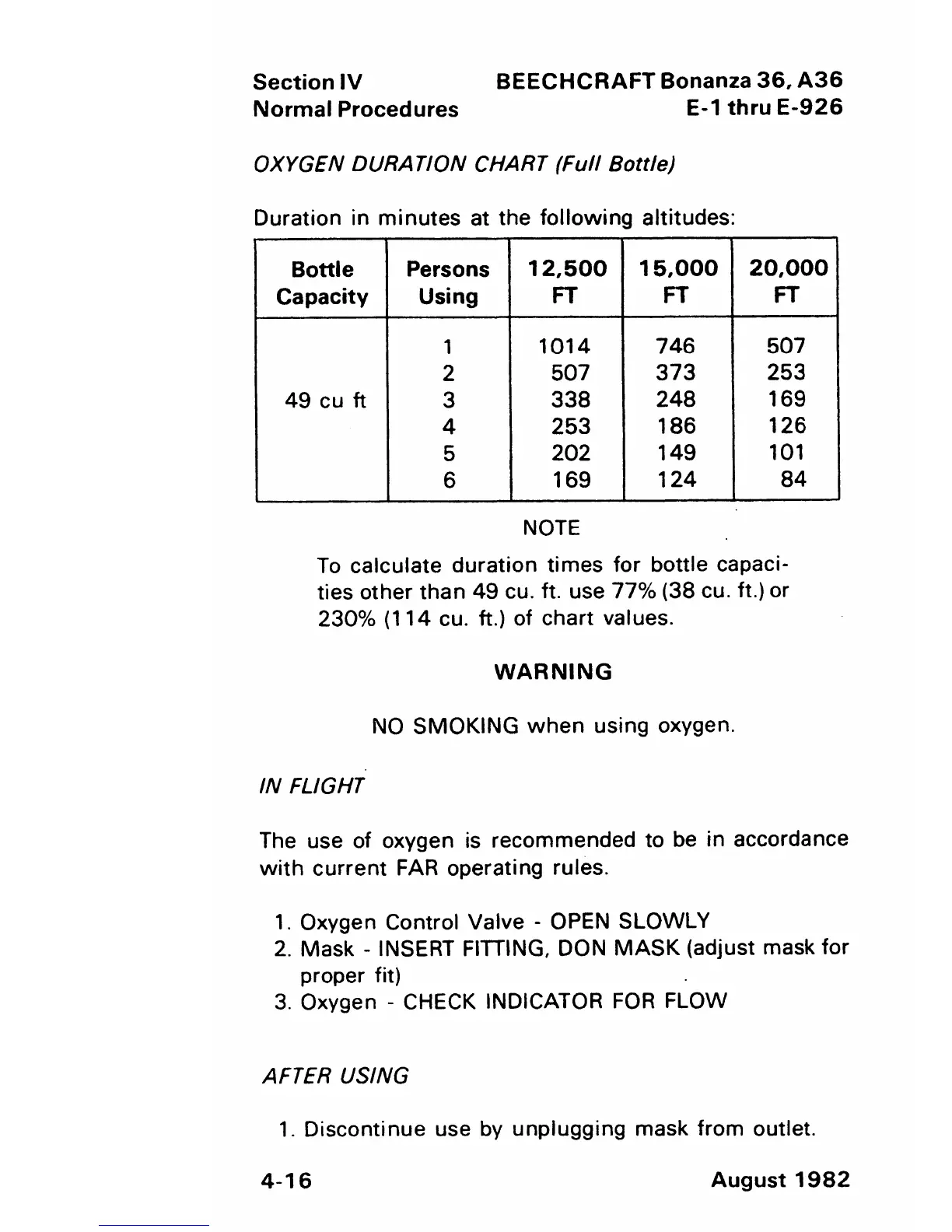 Beechcraft Bonanza 36 - Oxygen Duration Chart (Full Bottle); Use of Oxygen in Flight; After Using Oxygen