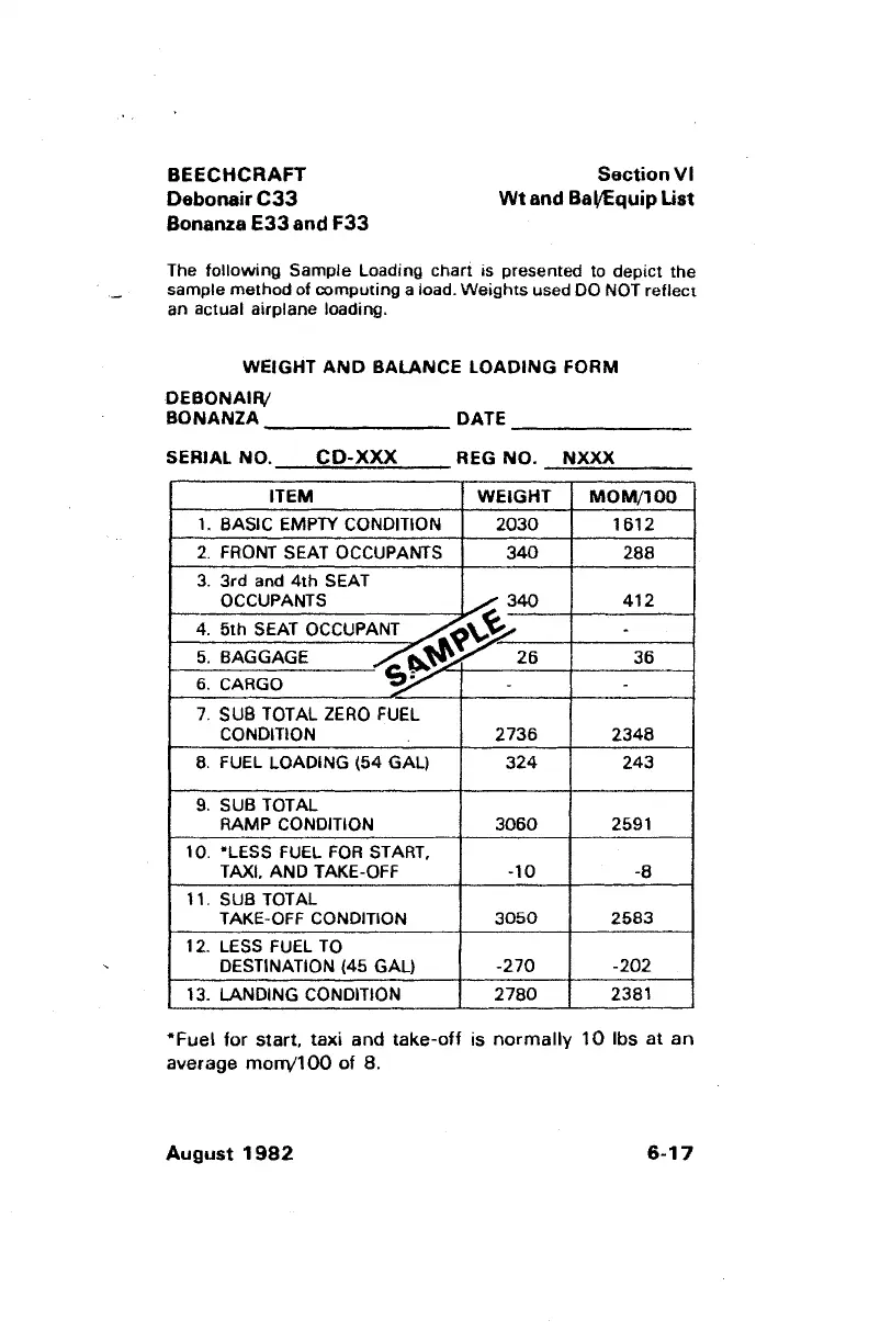 Beechcraft Bonanza E33 - Weight and Balance Loading Form