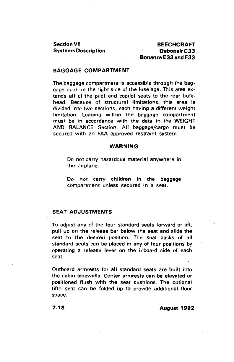 Beechcraft Bonanza E33 - Baggage Compartment; Seat Adjustments