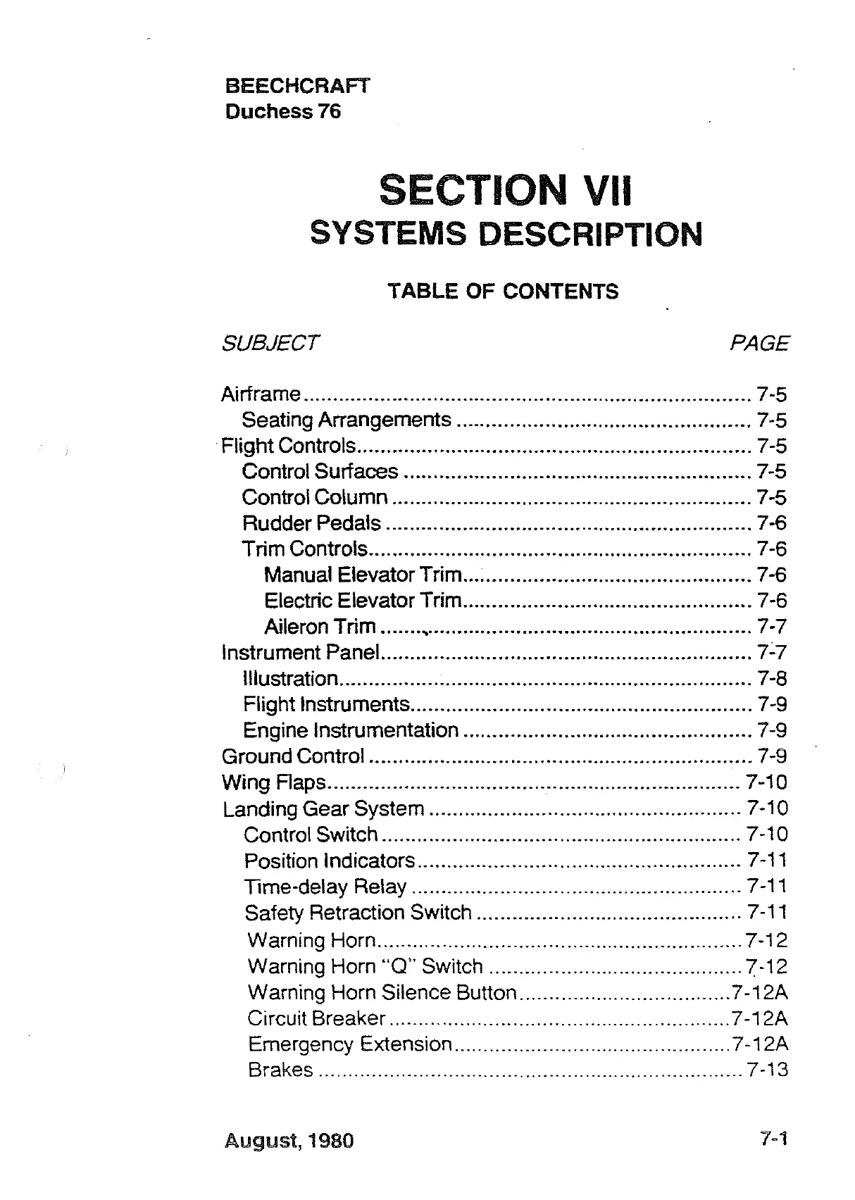 Beechcraft Duchess 76 - Section VII Systems Description