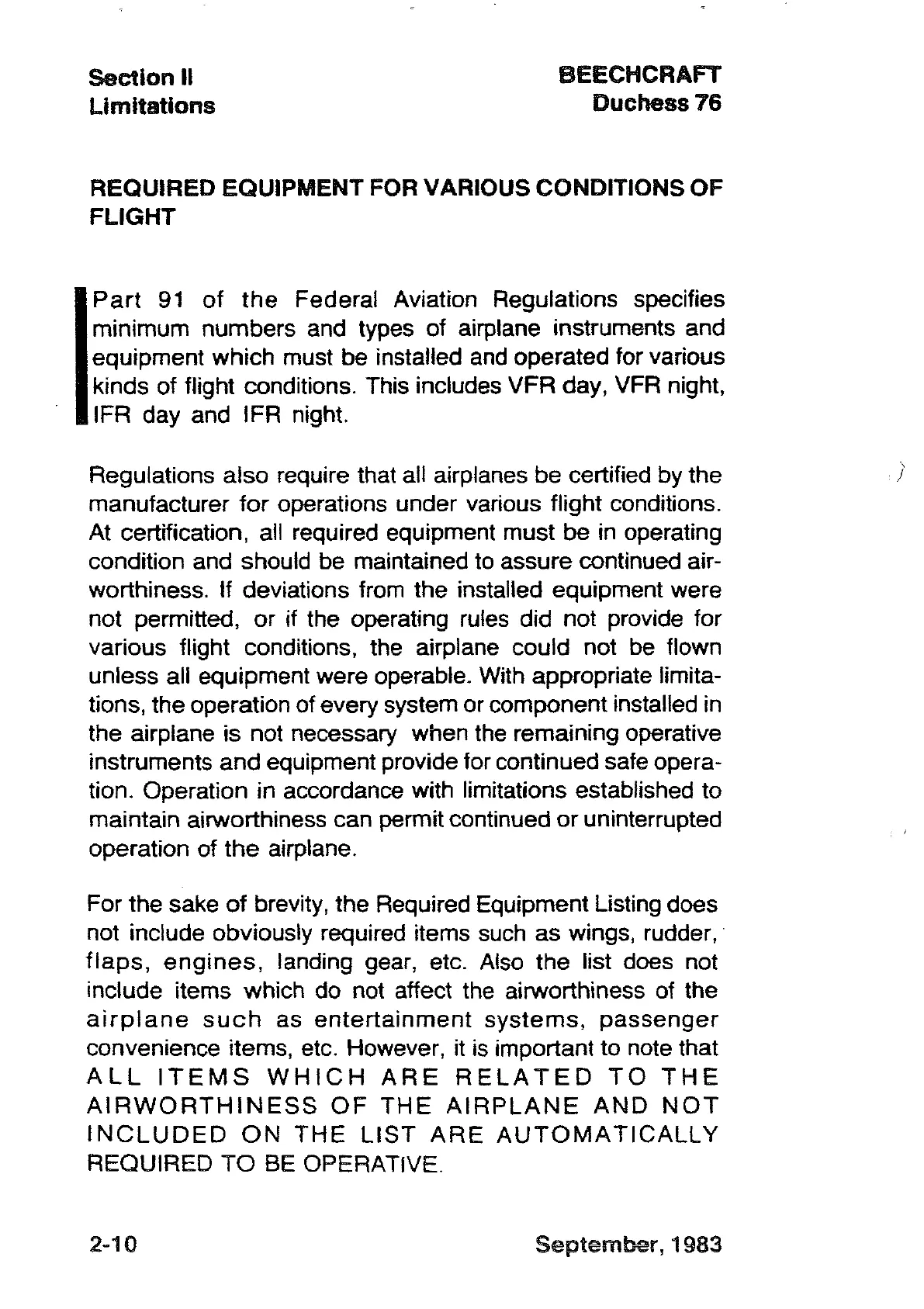 REQUIRED EQUIPMENT FOR VARIOUS CONDITIONS