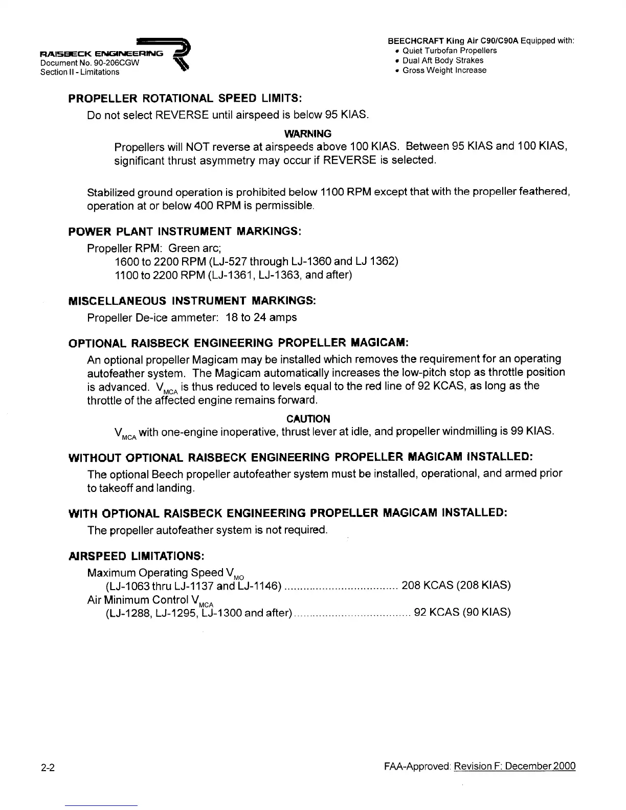 Beechcraft KING AIR C90A - Propeller and Airspeed Limitations; Propeller Rotational Speed Limits; Airspeed Limitations