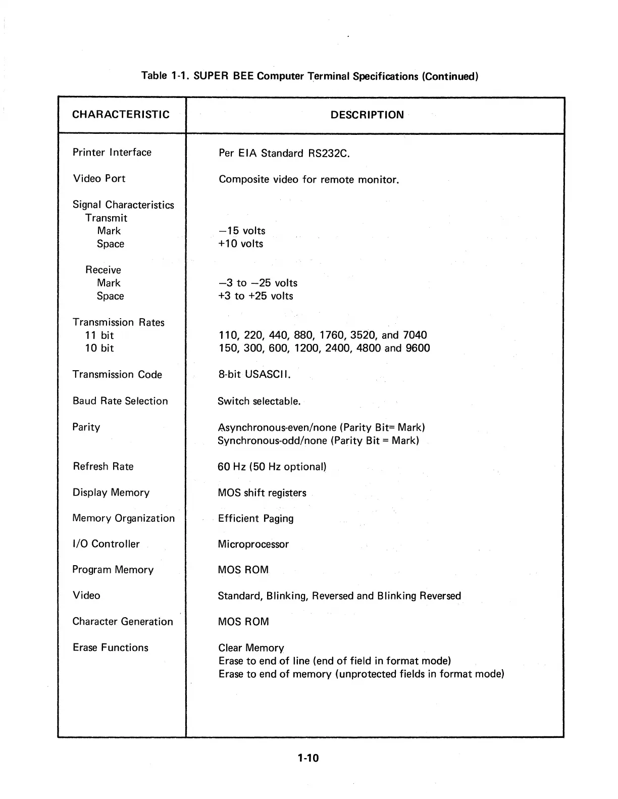 Table 1-1. SUPER BEE Computer Terminal Specifications (Continued)