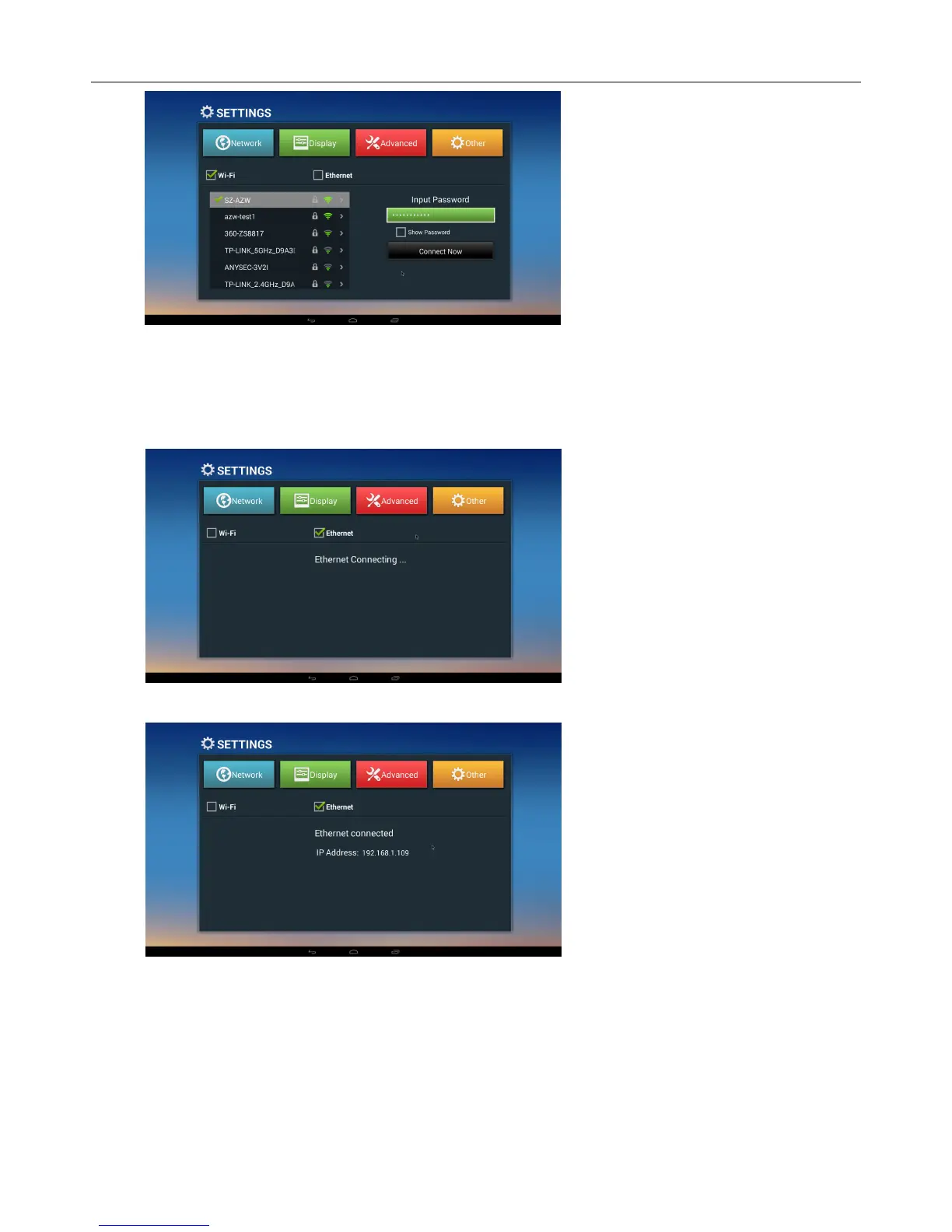 Home Screen SETTINGSNetwork Select “Ethernet” to open Ethernet function