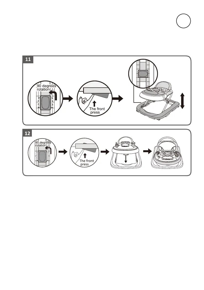 Ta barnet ut av gåstolen før du justerer setehøyden. Trykk sikkerhetsknappen under