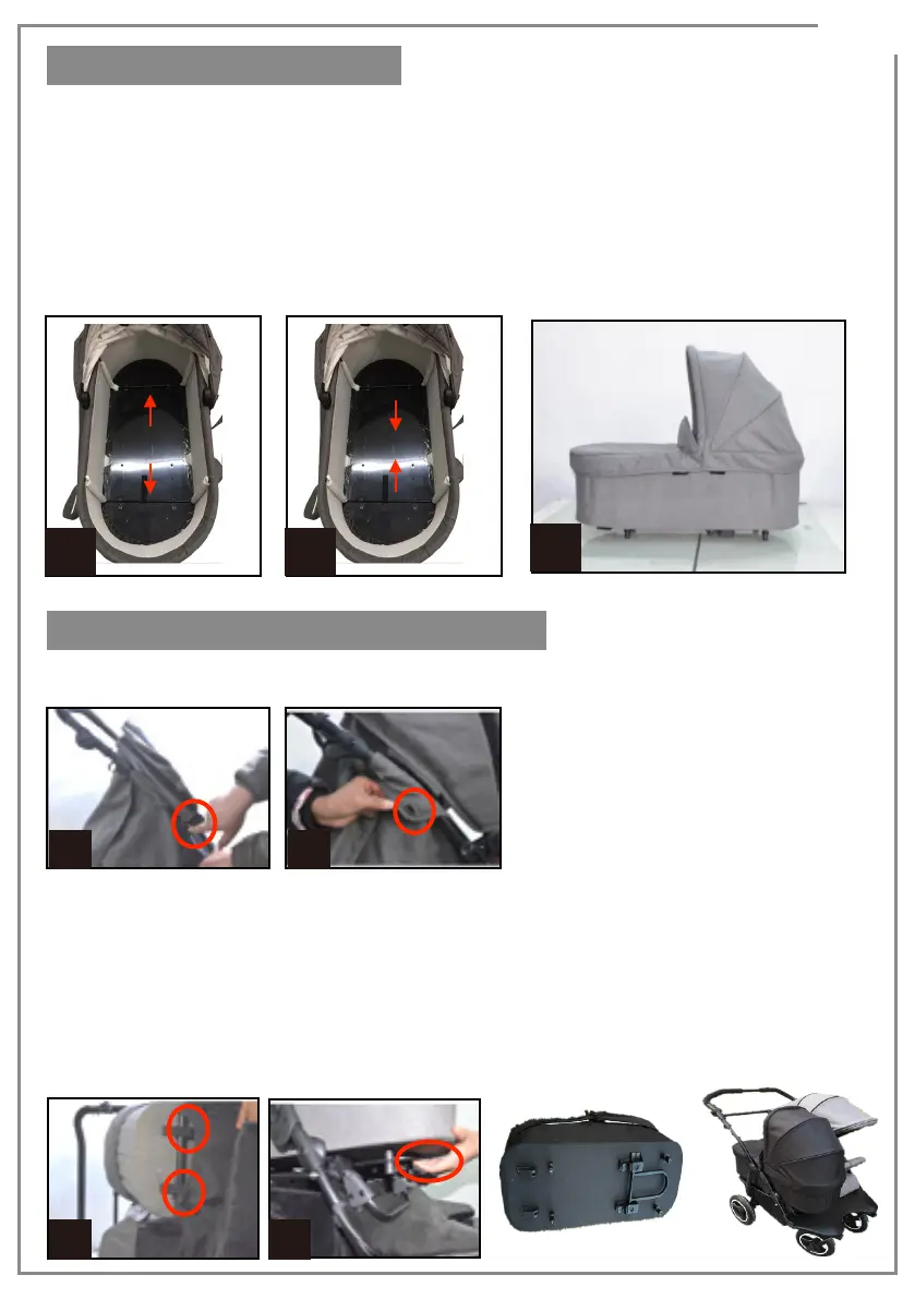 The carry cot will be placed up, the bottom of the carry cot fixes the basket tube, pull the pull