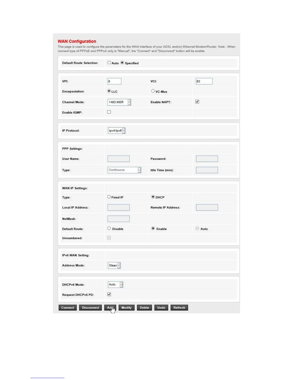 WAN IP settings, set the Type as DHCP, enable the Default Route, then click the Add button to