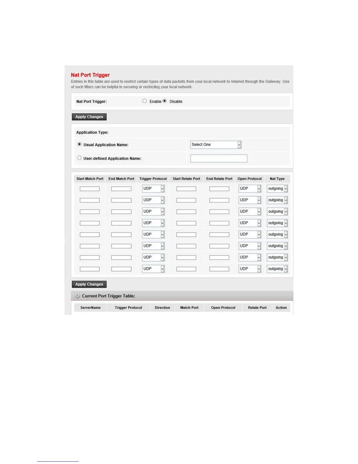 Go to Advanced->NAT->Port Trigger page, you can configure the port trigger rules.