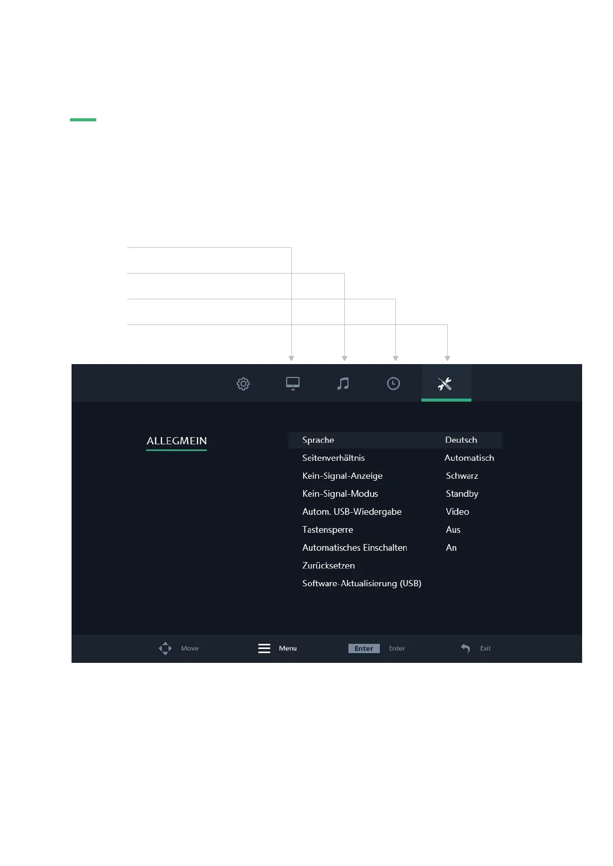Drücken Sie die „MENU“-Taste auf der Fernbedienung, um ins Hauptmenü zu gelangen. Das Menü besteht aus 4 Untermenüs: