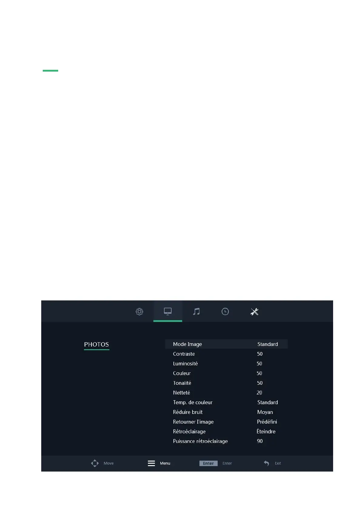 Sélectionner le mode image proposé. Sélectionner le réglage "personnalisée" pour ajuster manuellement les paramètres.