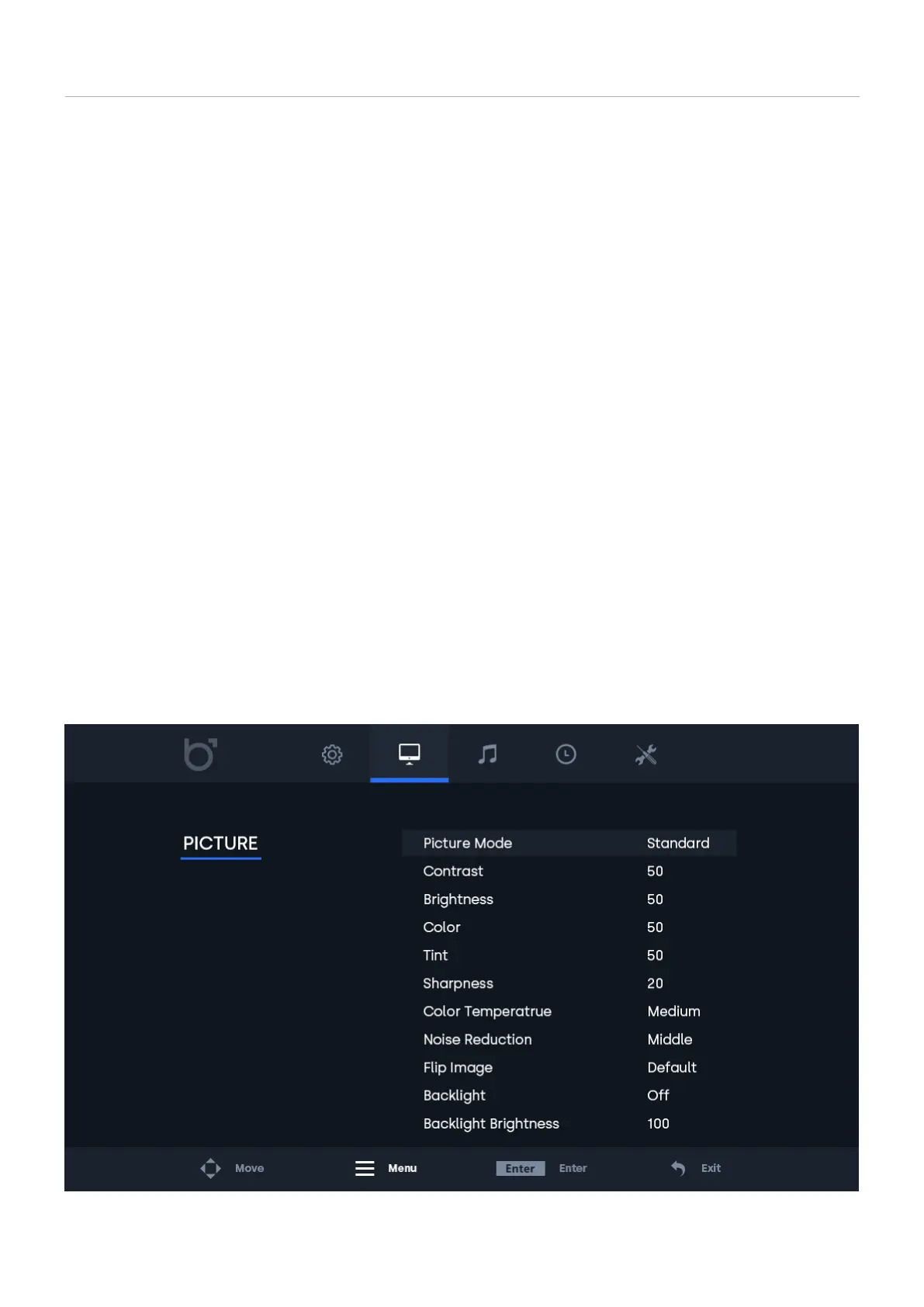 Select your preferred picture mode. Select the ‘’User’’ preset to manually adjust each value.
