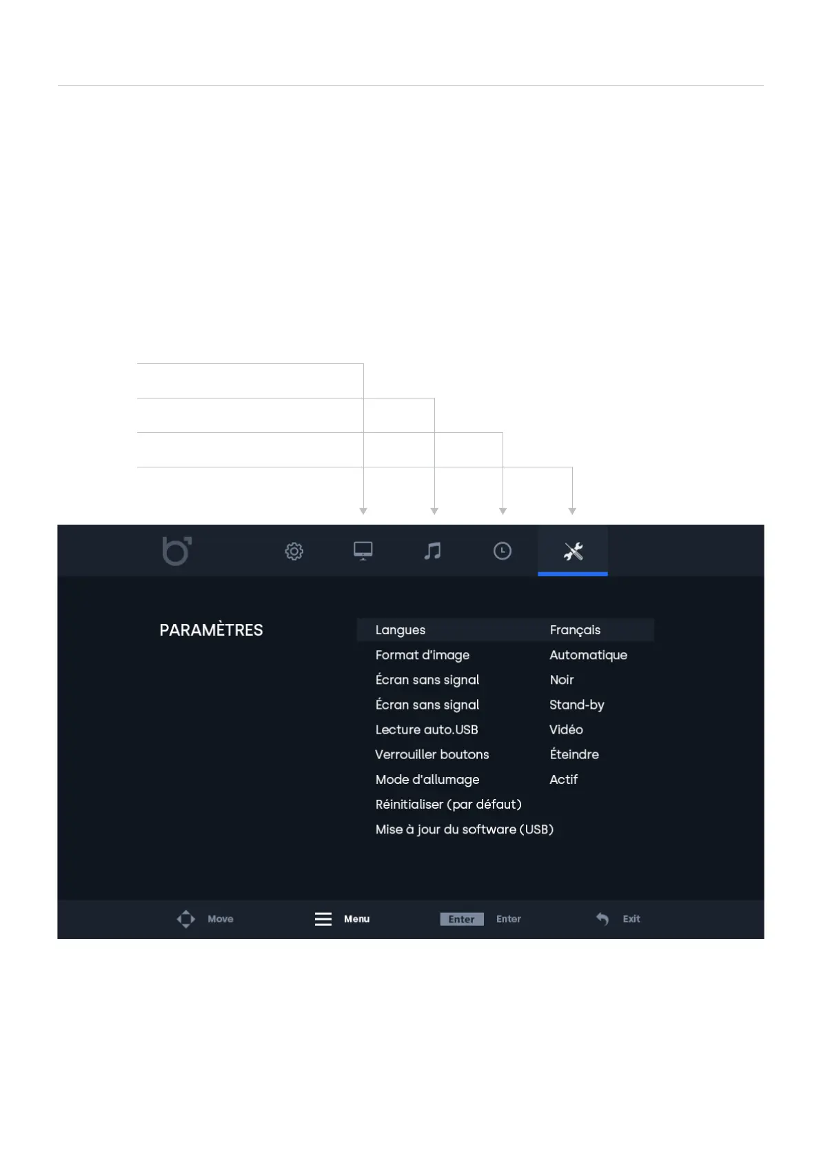 Pour accéder au menu, appuyez sur le bouton “MENU” de la télécommande ou de l’écran. Le menu inclut 4 catégories de paramètres