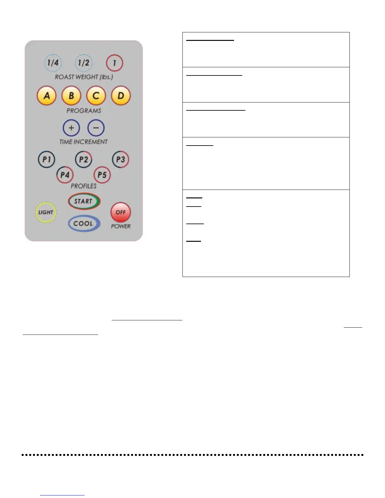 OFF: Shuts off the roaster. Do not press OFF during
