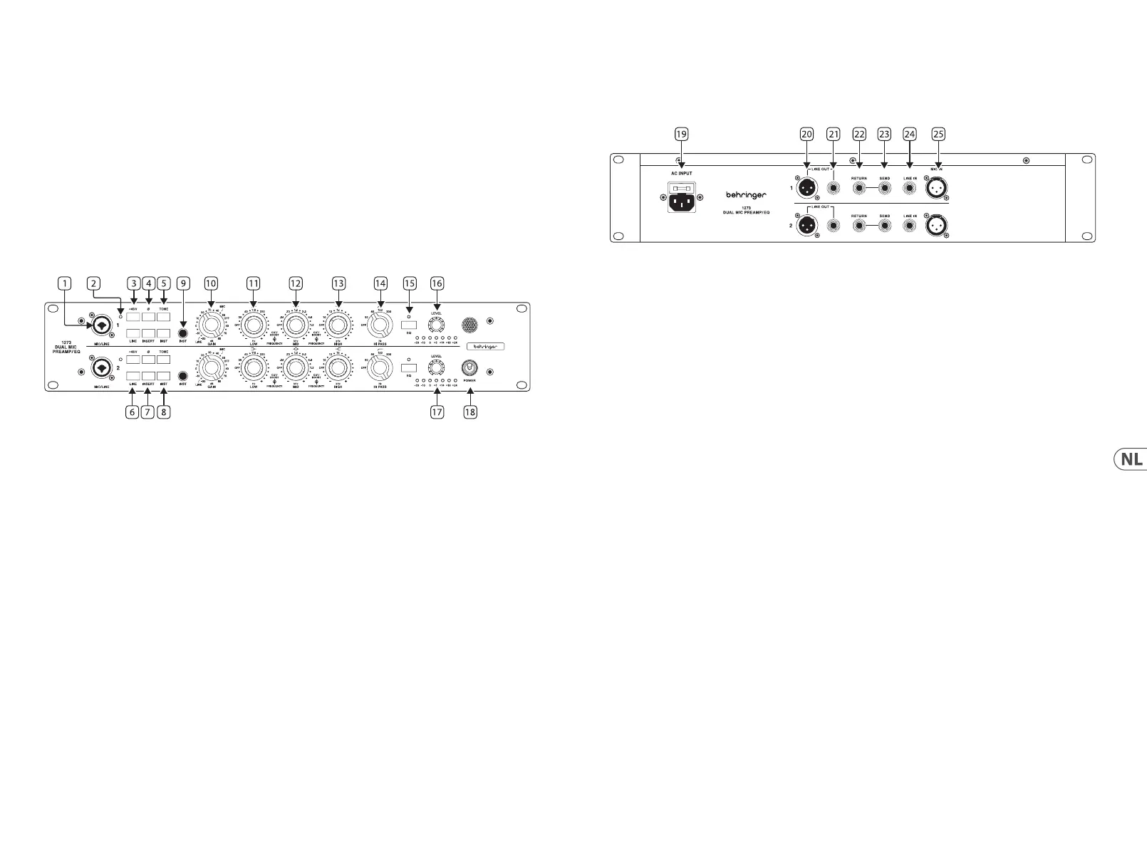 16. OUTPUT LEVEL - Om de volledige gain te bereiken zoals die wordt aangegeven op de gain-schakelaar, moet het niveau op maximaal