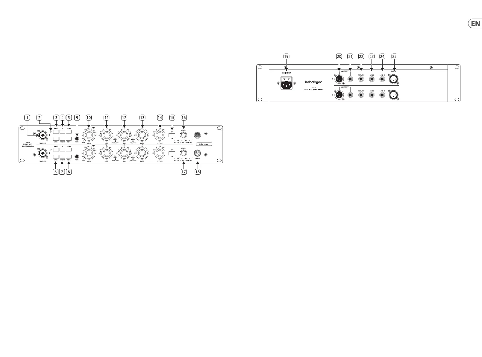 15. EQ IN – Switch the EQ in and out of circuit. The LED indicates the EQ circuit is active.
