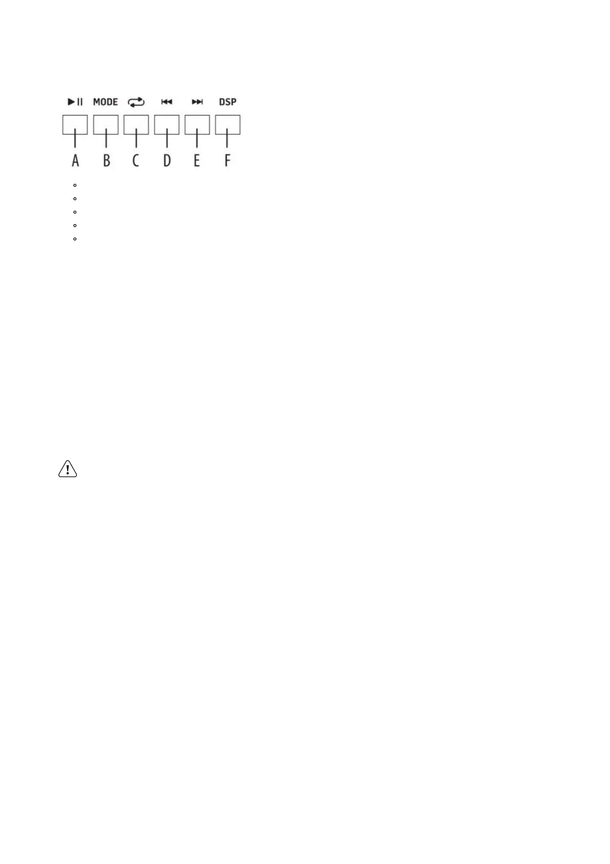 E. FORWARD: Press once to move to the next song. Press and hold to increase the digital volume. F. DSP: