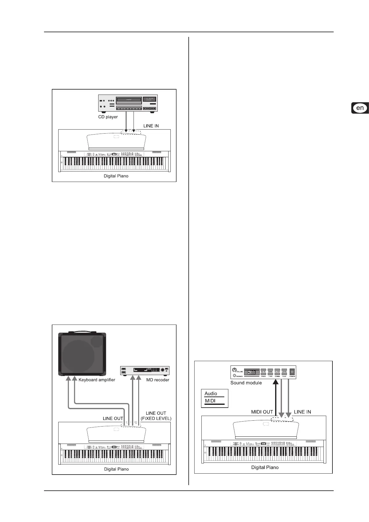 connecting the digital piano to external keyboard ampliers, P.A.