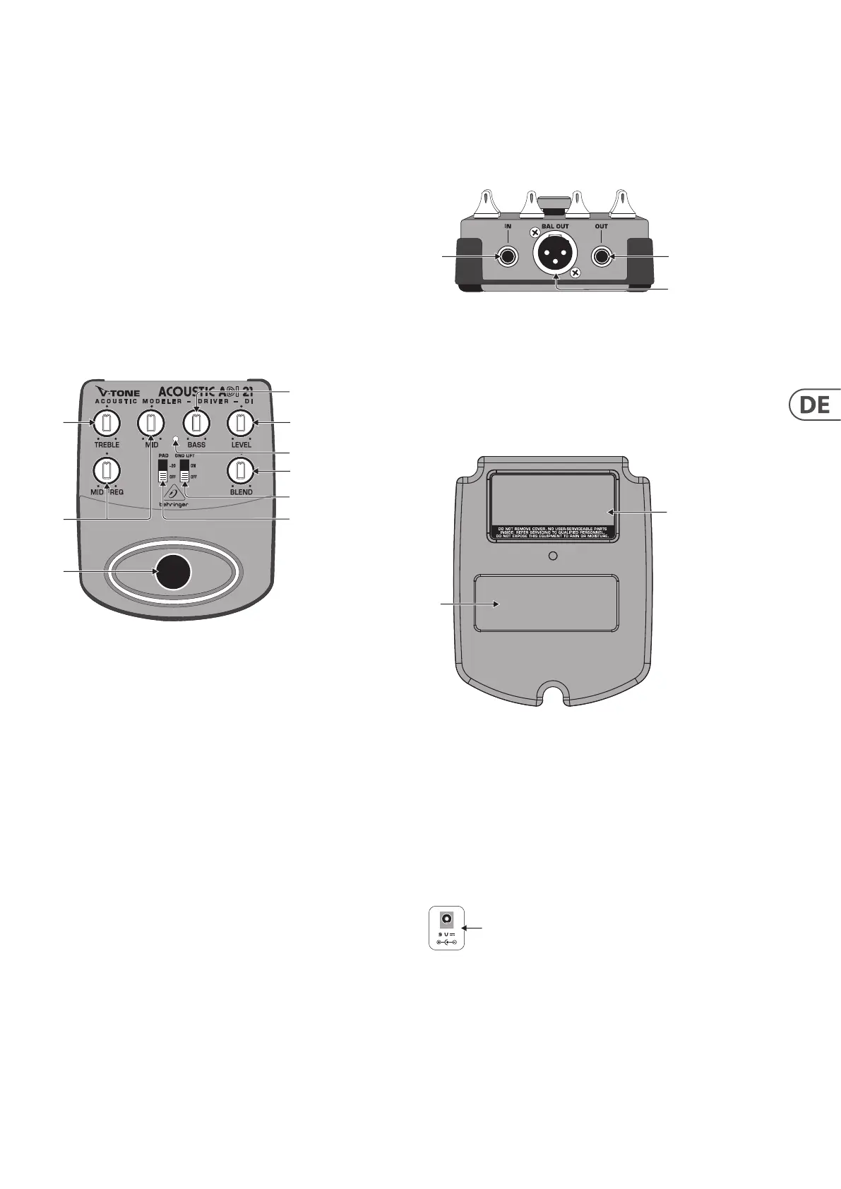 (14) BATTERIEFACH. Entferne die Abdeckung, um die 9 V Batterie zu