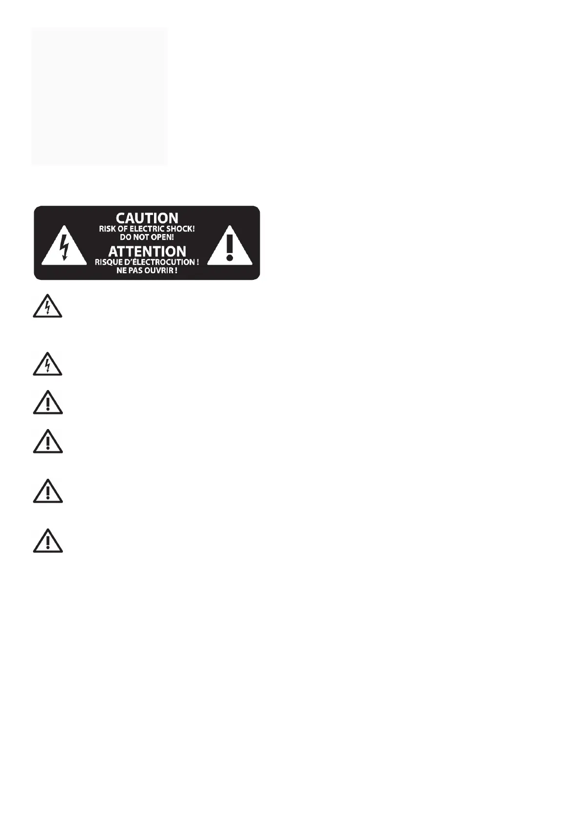 To reduce the risk of electric shock, do not remove the top cover (or the rear section). No user-serviceable parts inside. Refer servicing to