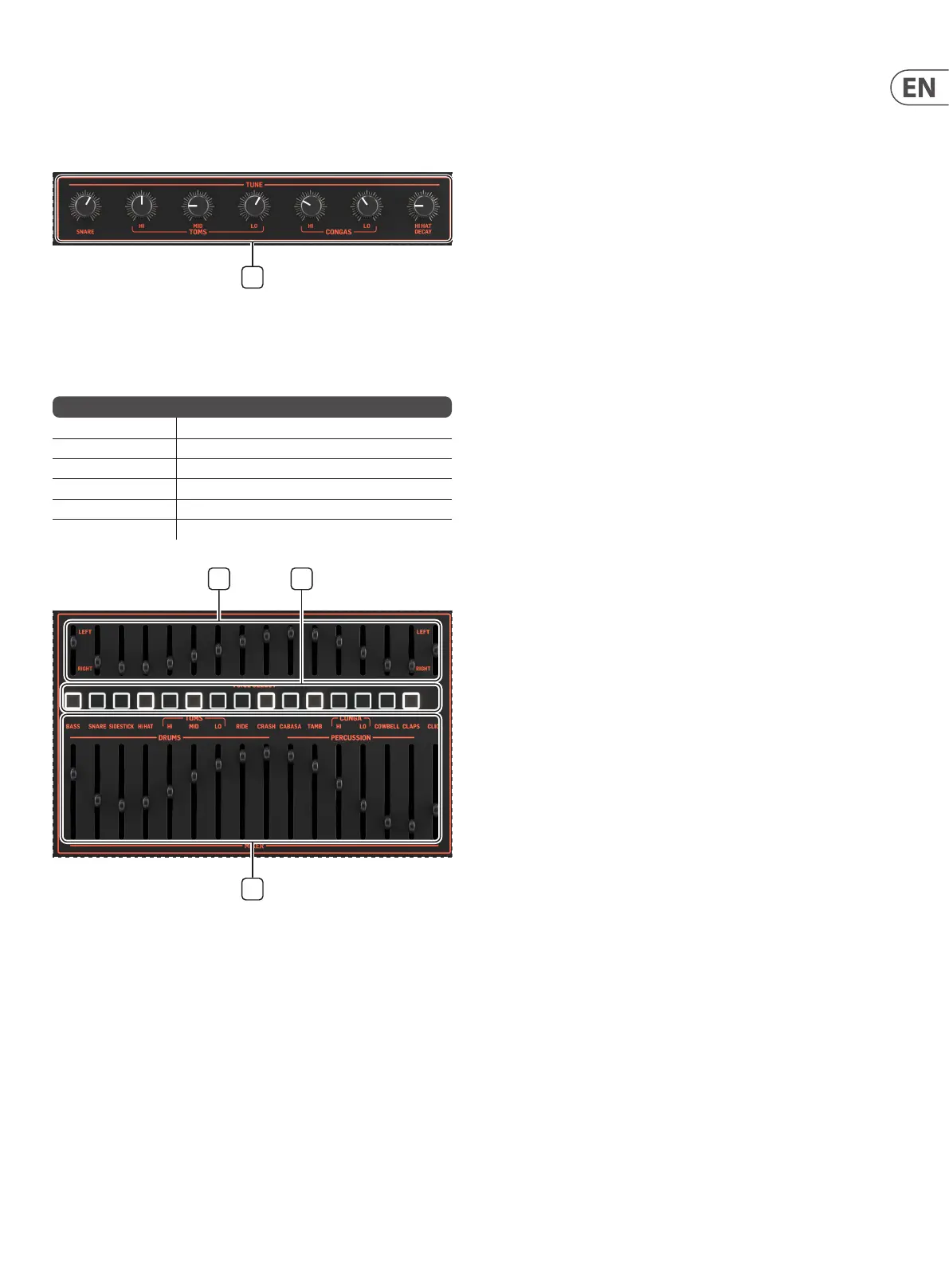 These controls are used to tune the snares, toms and congas and set the hi-hat