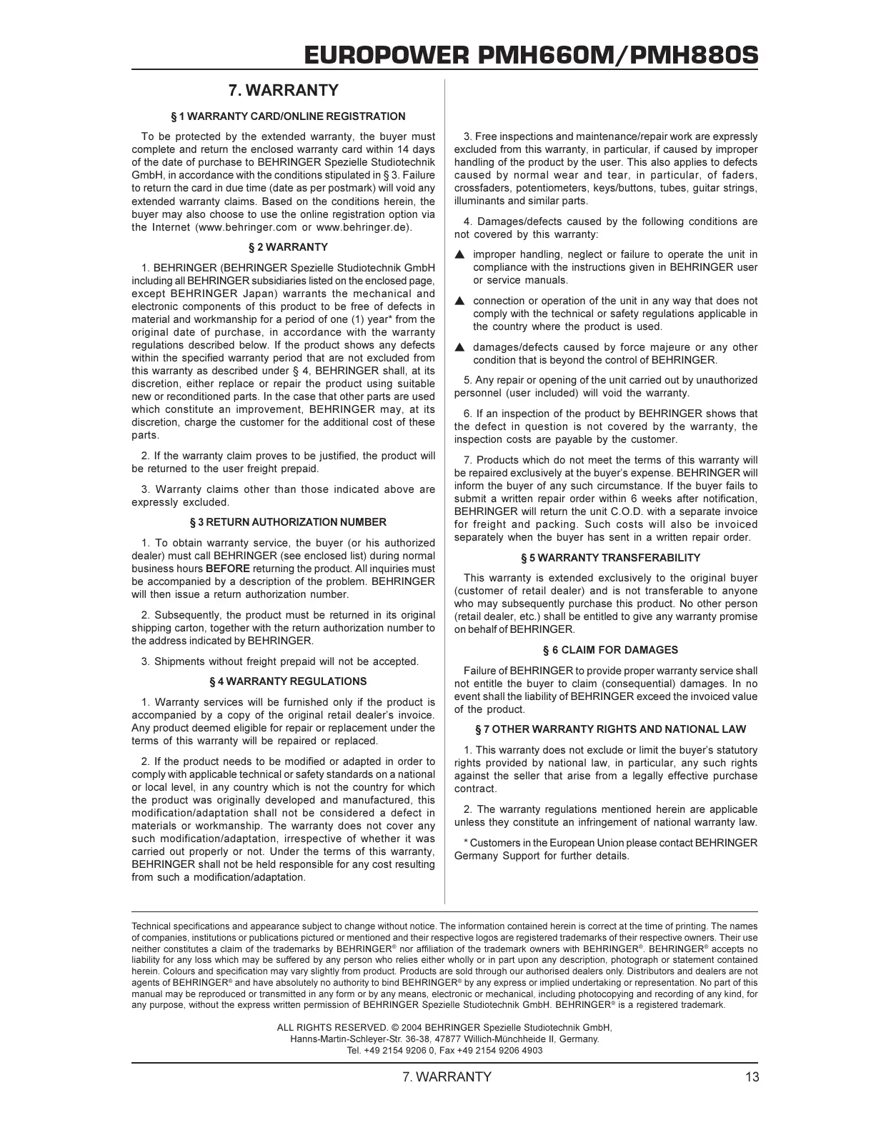 BEHRINGER shall not be held responsible for any cost resulting