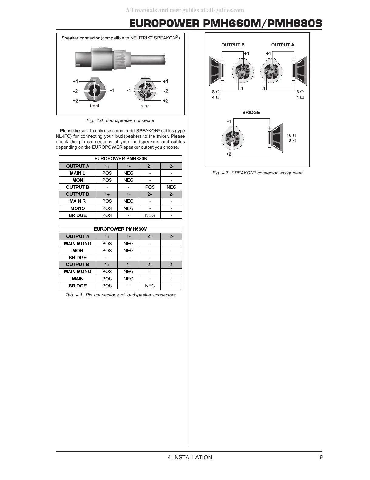 Tab. 4.1: Pin connections of loudspeaker connectors