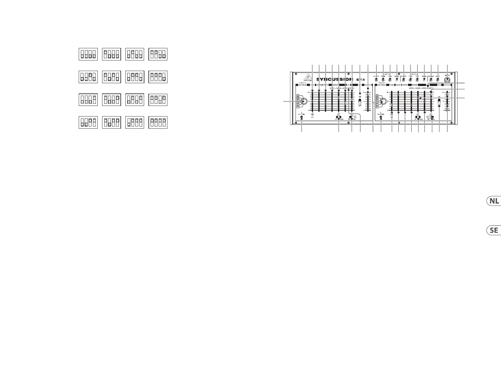 (42) (MIDI) CHANNEL – gebruik deze dipschakelaar om het MIDI-kanaal in te stellen (zie MIDI-bediening hieronder).